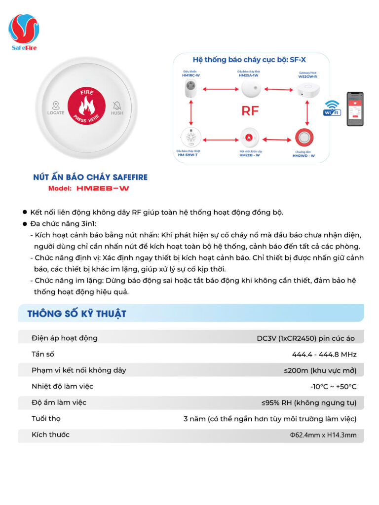 Với chuẩn kết nối không dây RF (tần số 444.4 – 444.8 MHz), HM2EBW đảm bảo tín hiệu truyền đi ổn định, chính xác và đồng bộ với toàn bộ hệ thống báo cháy SafeFire trong công trình.